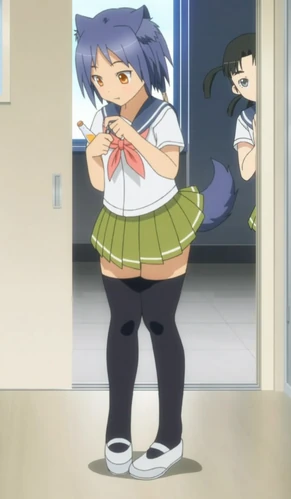 Galil, for being mostly based on the AK design, features a set of fox ears and a short fluffy tail. Her skin is lightly tanned, and she has average height. Her eyes are orange-golden and she has long slate-blue hair tied in twin tails. Her upper canine teeth are fang-like, and Galil wears normal middle-schooler uniform of Seishou Academy with the ribbon tied in a different style.. As seen on the beach, given her skeletal stock, she wears a black thong one-piece swimsuit.